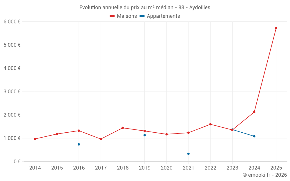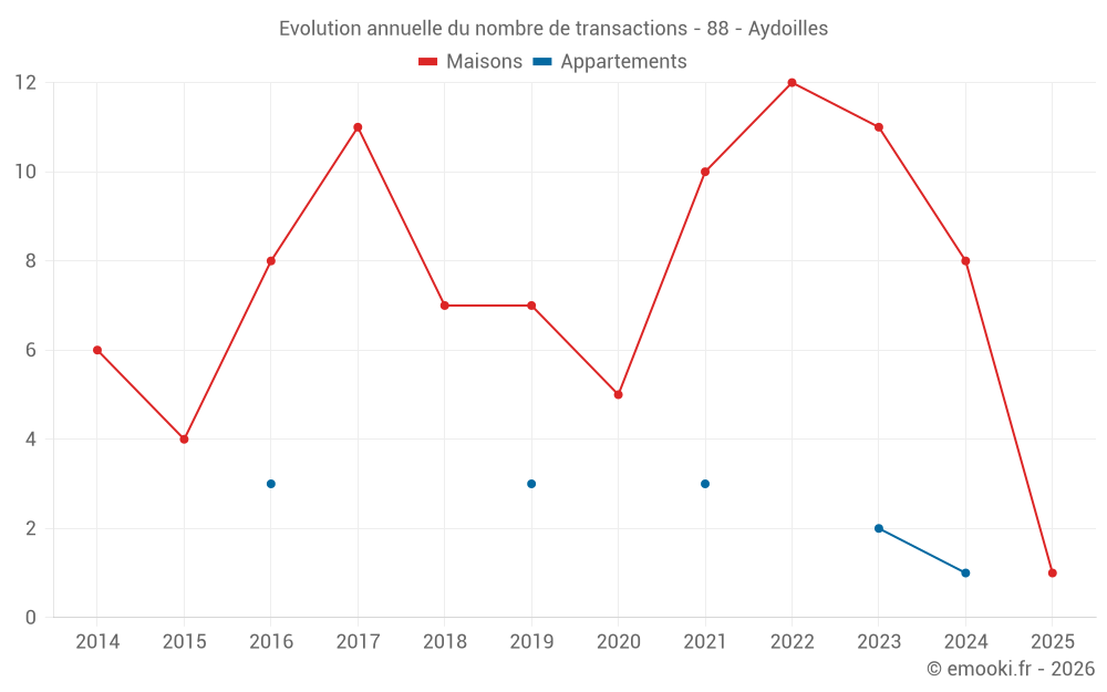Le prix médian sur les 17 transactions de maisons des 24 derniers mois dans la commune d'Aydoilles était de 1 784 € par mètre carré pour une valeur foncière médiane de 185 500 €. Sur cette période 60% des transactions se sont situées entre 1 336 et 2 421 € par mètre carré (du 2ème au 8ème déciles).
