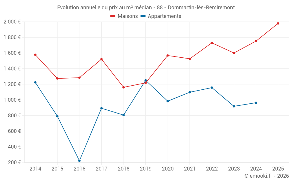 Le prix médian sur les 32 transactions de maisons des 24 derniers mois dans la commune de Dommartin-lès-Remiremont était de 1 864 € par mètre carré pour une valeur foncière médiane de 182 515 €. Sur cette période 60% des transactions se sont situées entre 1 233 et 2 278 € par mètre carré (du 2ème au 8ème déciles).