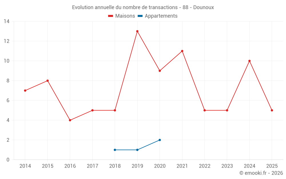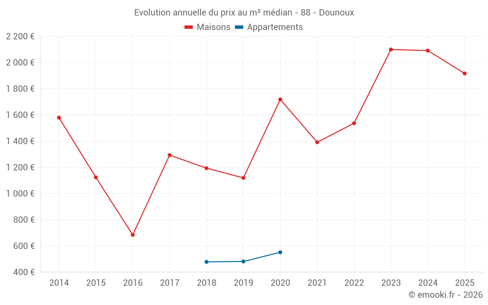 Le prix médian sur les 15 transactions de maisons des 24 derniers mois dans la commune de Dounoux était de 2 040 € par mètre carré pour une valeur foncière médiane de 189 920 €. Sur cette période 60% des transactions se sont situées entre 1 812 et 2 222 € par mètre carré (du 2ème au 8ème déciles).