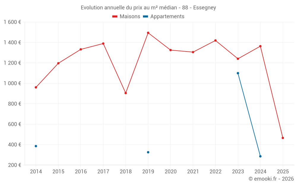 Le prix médian sur les 19 transactions de maisons des 24 derniers mois dans la commune d'Essegney était de 1 250 € par mètre carré pour une valeur foncière médiane de 125 000 €. Sur cette période 60% des transactions se sont situées entre 592 et 1 844 € par mètre carré (du 2ème au 8ème déciles).
