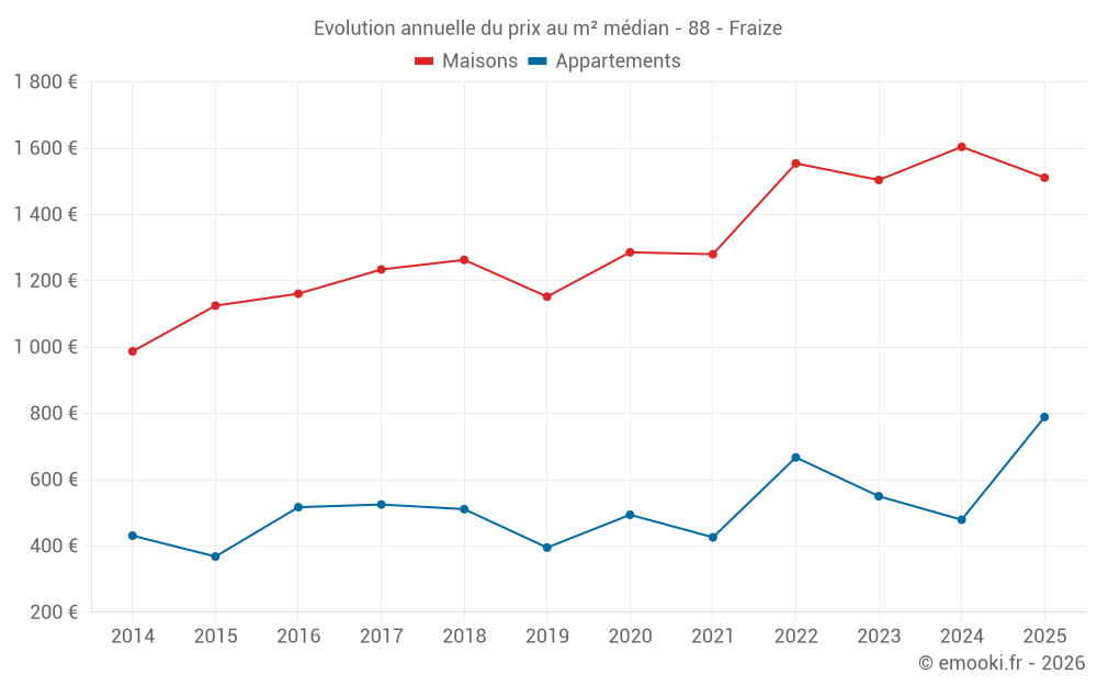 Le prix médian sur les 20 transactions d'appartements des 24 derniers mois dans la commune de Fraize était de 678 € par mètre carré pour une valeur foncière médiane de 60 250 €. Sur cette période 60% des transactions se sont situées entre 167 et 977 € par mètre carré (du 2ème au 8ème déciles).