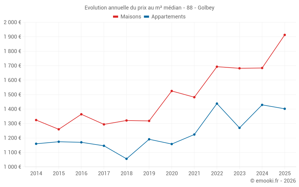Le prix médian sur les 29 transactions de maisons des 6 derniers mois dans la commune de Golbey était de 1 913 € par mètre carré pour une valeur foncière médiane de 138 700 €. Sur cette période 60% des transactions se sont situées entre 1 193 et 2 367 € par mètre carré (du 2ème au 8ème déciles).