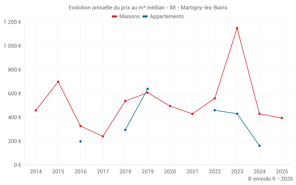 Le prix médian sur les 18 transactions de maisons des 24 derniers mois dans la commune de Martigny-les-Bains était de 464 € par mètre carré pour une valeur foncière médiane de 32 875 €. Sur cette période 60% des transactions se sont situées entre 183 et 939 € par mètre carré (du 2ème au 8ème déciles).