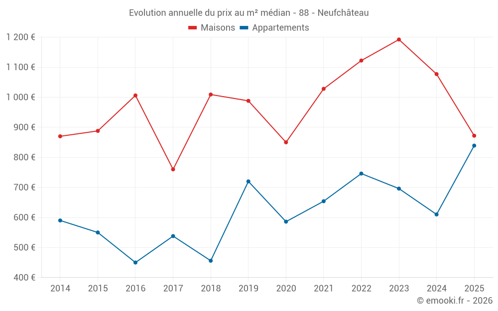 Le prix médian sur les 18 transactions de maisons des 6 derniers mois dans la commune de Neufchâteau était de 872 € par mètre carré pour une valeur foncière médiane de 107 112 €. Sur cette période 60% des transactions se sont situées entre 685 et 1 289 € par mètre carré (du 2ème au 8ème déciles).