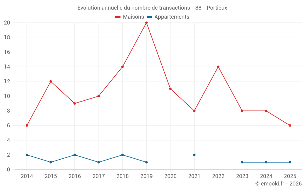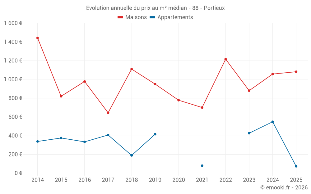 Le prix médian sur les 18 transactions de maisons des 24 derniers mois dans la commune de Portieux était de 1 012 € par mètre carré pour une valeur foncière médiane de 95 000 €. Sur cette période 60% des transactions se sont situées entre 726 et 1 345 € par mètre carré (du 2ème au 8ème déciles).