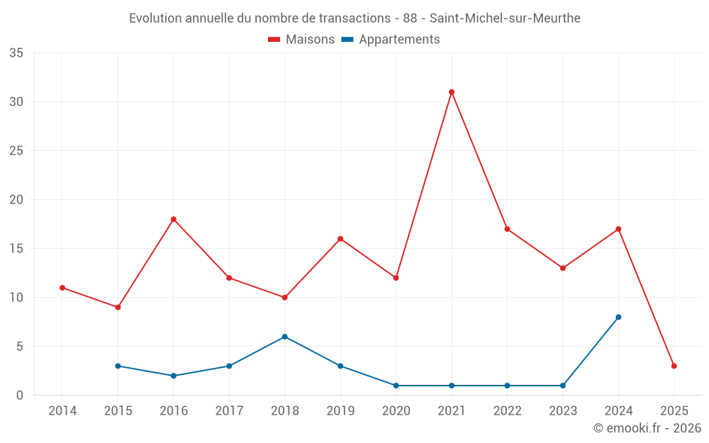 Le prix médian sur les 28 transactions de maisons des 24 derniers mois dans la commune de Saint-Michel-sur-Meurthe était de 1 540 € par mètre carré pour une valeur foncière médiane de 170 000 €. Sur cette période 60% des transactions se sont situées entre 1 018 et 2 232 € par mètre carré (du 2ème au 8ème déciles).