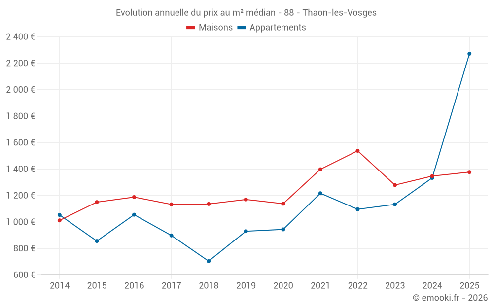 Le prix médian sur les 23 transactions de maisons des 6 derniers mois dans la commune de Thaon-les-Vosges était de 1 377 € par mètre carré pour une valeur foncière médiane de 124 000 €. Sur cette période 60% des transactions se sont situées entre 949 et 2 271 € par mètre carré (du 2ème au 8ème déciles).