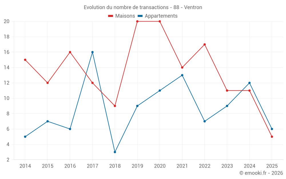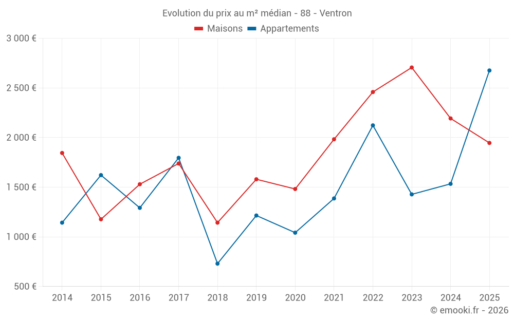 Le prix médian sur les 21 transactions de maisons des 24 derniers mois dans la commune de Ventron était de 2 193 € par mètre carré pour une valeur foncière médiane de 170 000 €. Sur cette période 60% des transactions se sont situées entre 1 300 et 3 014 € par mètre carré (du 2ème au 8ème déciles).