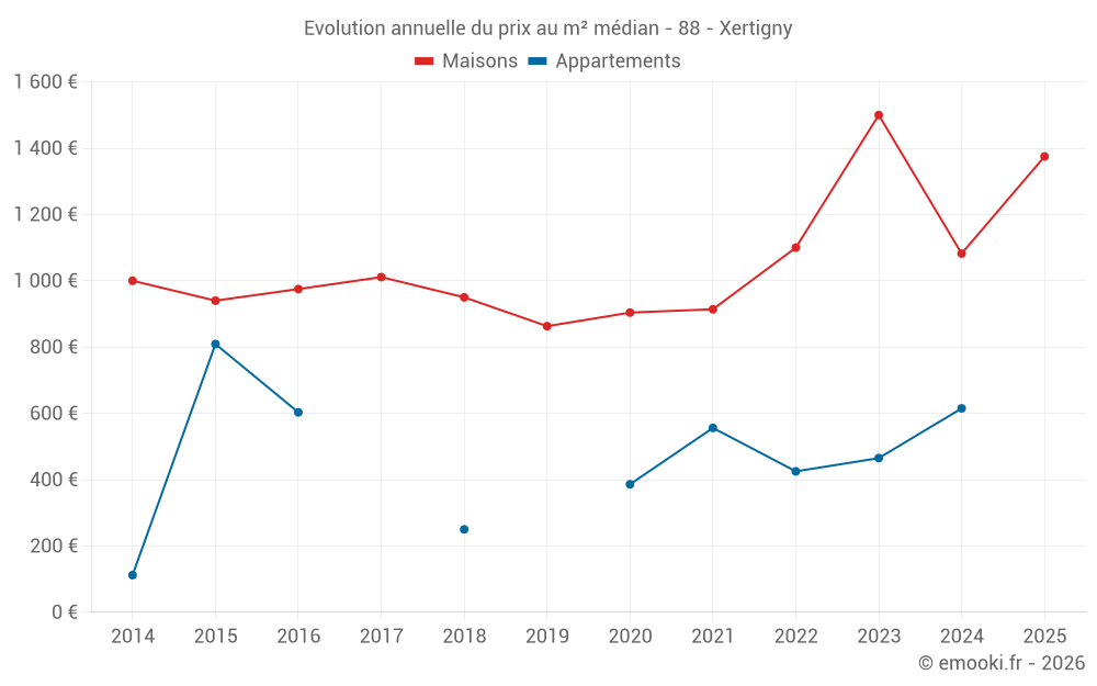Le prix médian sur les 25 transactions de maisons des 12 derniers mois dans la commune de Xertigny était de 1 132 € par mètre carré pour une valeur foncière médiane de 90 000 €. Sur cette période 60% des transactions se sont situées entre 711 et 1 523 € par mètre carré (du 2ème au 8ème déciles).