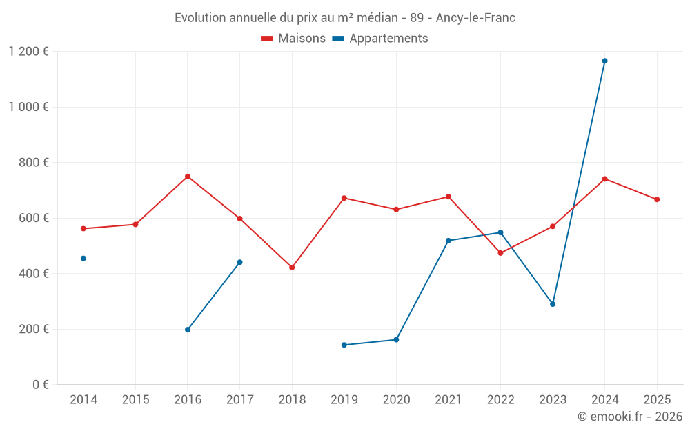 Le prix médian sur les 23 transactions de maisons des 24 derniers mois dans la commune d'Ancy-le-Franc était de 667 € par mètre carré pour une valeur foncière médiane de 35 000 €. Sur cette période 60% des transactions se sont situées entre 247 et 920 € par mètre carré (du 2ème au 8ème déciles).
