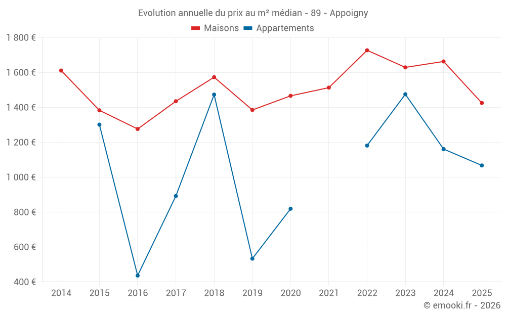 Le prix médian sur les 32 transactions de maisons des 12 derniers mois dans la commune d'Appoigny était de 1 513 € par mètre carré pour une valeur foncière médiane de 145 075 €. Sur cette période 60% des transactions se sont situées entre 1 133 et 2 045 € par mètre carré (du 2ème au 8ème déciles).