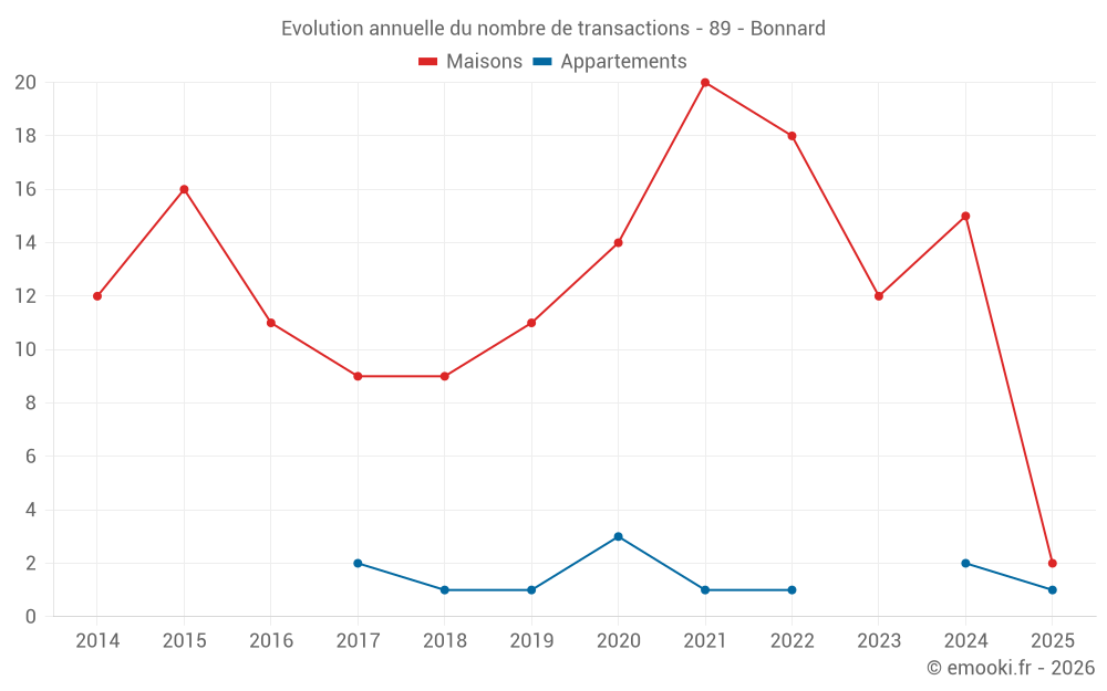 Le prix médian sur les 19 transactions de maisons des 24 derniers mois dans la commune de Bonnard était de 1 579 € par mètre carré pour une valeur foncière médiane de 110 000 €. Sur cette période 60% des transactions se sont situées entre 975 et 2 080 € par mètre carré (du 2ème au 8ème déciles).