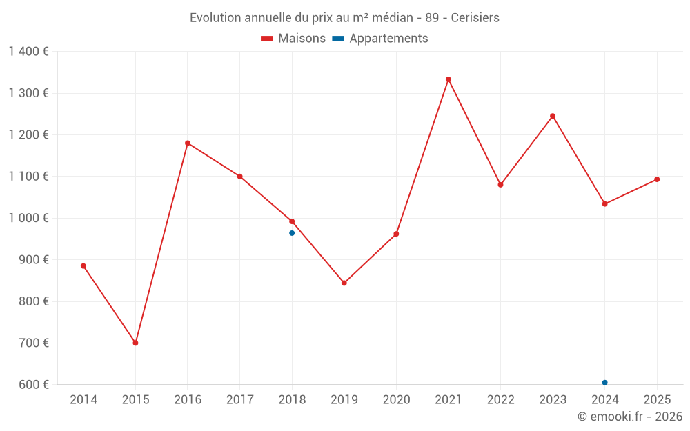 Le prix médian sur les 20 transactions de maisons des 24 derniers mois dans la commune de Cerisiers était de 1 034 € par mètre carré pour une valeur foncière médiane de 122 000 €. Sur cette période 60% des transactions se sont situées entre 783 et 1 422 € par mètre carré (du 2ème au 8ème déciles).