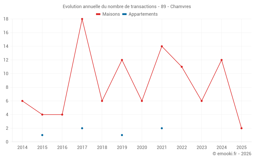 Le prix médian sur les 17 transactions de maisons des 24 derniers mois dans la commune de Chamvres était de 1 300 € par mètre carré pour une valeur foncière médiane de 145 000 €. Sur cette période 60% des transactions se sont situées entre 955 et 2 026 € par mètre carré (du 2ème au 8ème déciles).