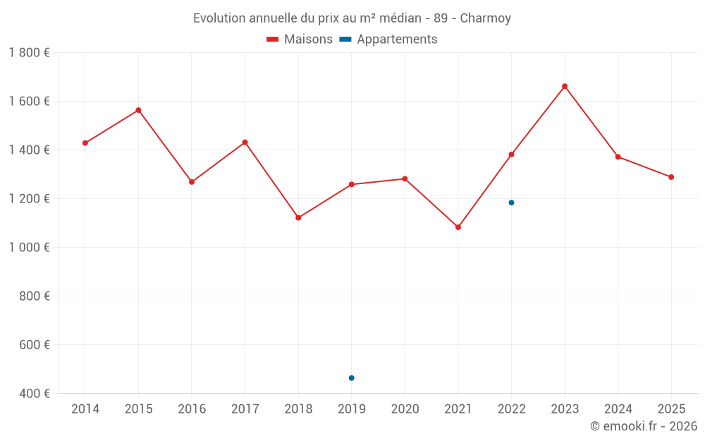 Le prix médian sur les 17 transactions de maisons des 12 derniers mois dans la commune de Charmoy était de 1 468 € par mètre carré pour une valeur foncière médiane de 98 000 €. Sur cette période 60% des transactions se sont situées entre 854 et 1 740 € par mètre carré (du 2ème au 8ème déciles).