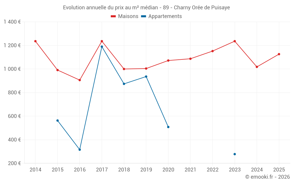 Le prix médian sur les 34 transactions de maisons des 6 derniers mois dans la commune de Charny Orée de Puisaye était de 1 126 € par mètre carré pour une valeur foncière médiane de 120 500 €. Sur cette période 60% des transactions se sont situées entre 527 et 1 692 € par mètre carré (du 2ème au 8ème déciles).