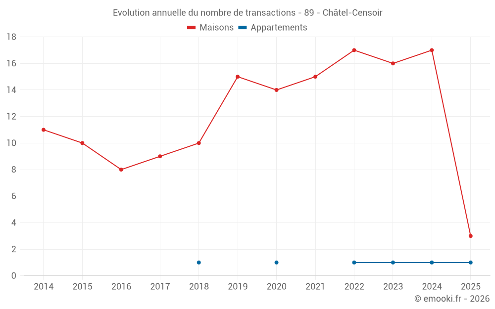 Le prix médian sur les 30 transactions de maisons des 24 derniers mois dans la commune de Châtel-Censoir était de 832 € par mètre carré pour une valeur foncière médiane de 63 500 €. Sur cette période 60% des transactions se sont situées entre 489 et 1 184 € par mètre carré (du 2ème au 8ème déciles).