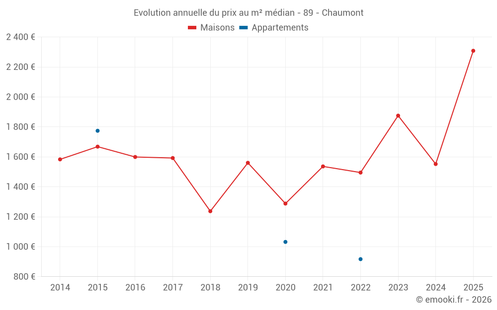 Le prix médian sur les 15 transactions de maisons des 24 derniers mois dans la commune de Chaumont était de 1 739 € par mètre carré pour une valeur foncière médiane de 139 000 €. Sur cette période 60% des transactions se sont situées entre 974 et 2 632 € par mètre carré (du 2ème au 8ème déciles).