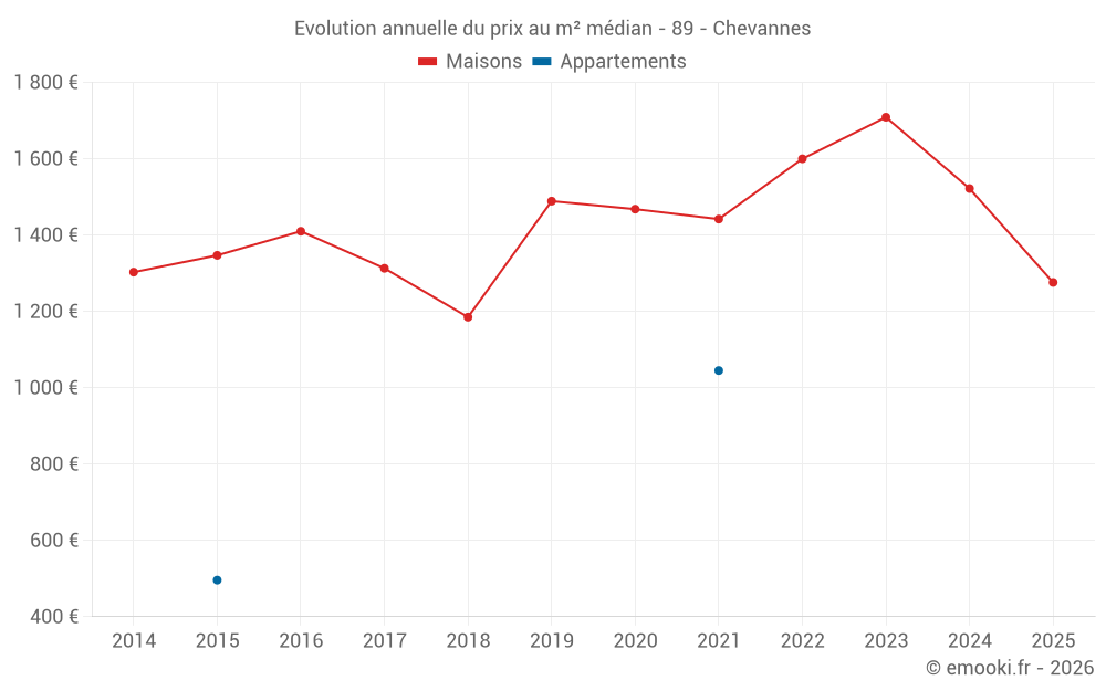 Le prix médian sur les 21 transactions de maisons des 12 derniers mois dans la commune de Chevannes était de 1 500 € par mètre carré pour une valeur foncière médiane de 143 000 €. Sur cette période 60% des transactions se sont situées entre 1 164 et 1 964 € par mètre carré (du 2ème au 8ème déciles).