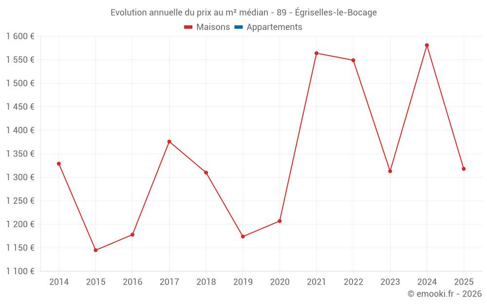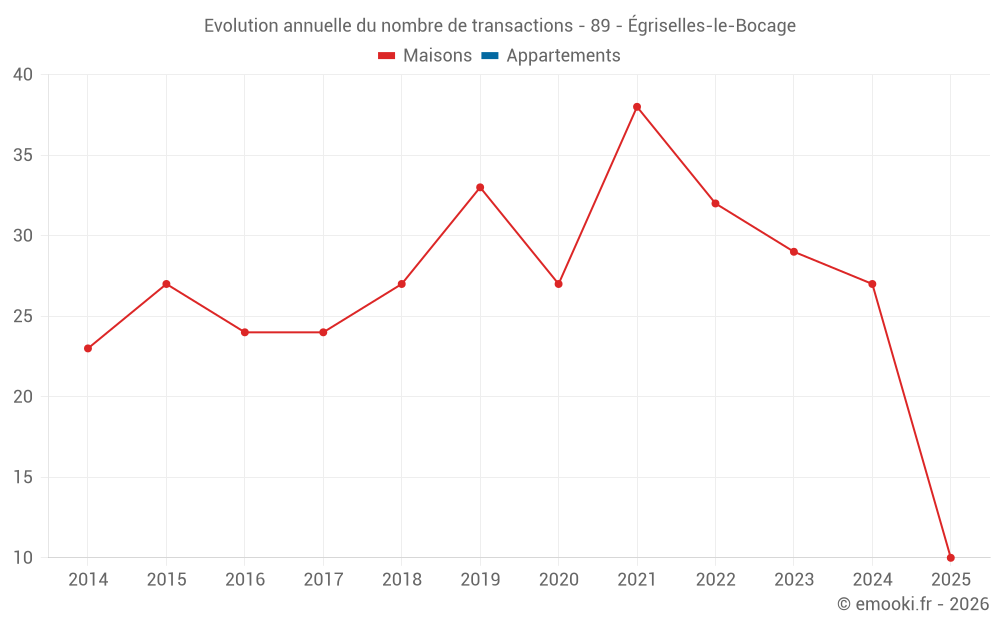 Le prix médian sur les 30 transactions de maisons des 12 derniers mois dans la commune d'Égriselles-le-Bocage était de 1 620 € par mètre carré pour une valeur foncière médiane de 106 500 €. Sur cette période 60% des transactions se sont situées entre 1 008 et 1 943 € par mètre carré (du 2ème au 8ème déciles).