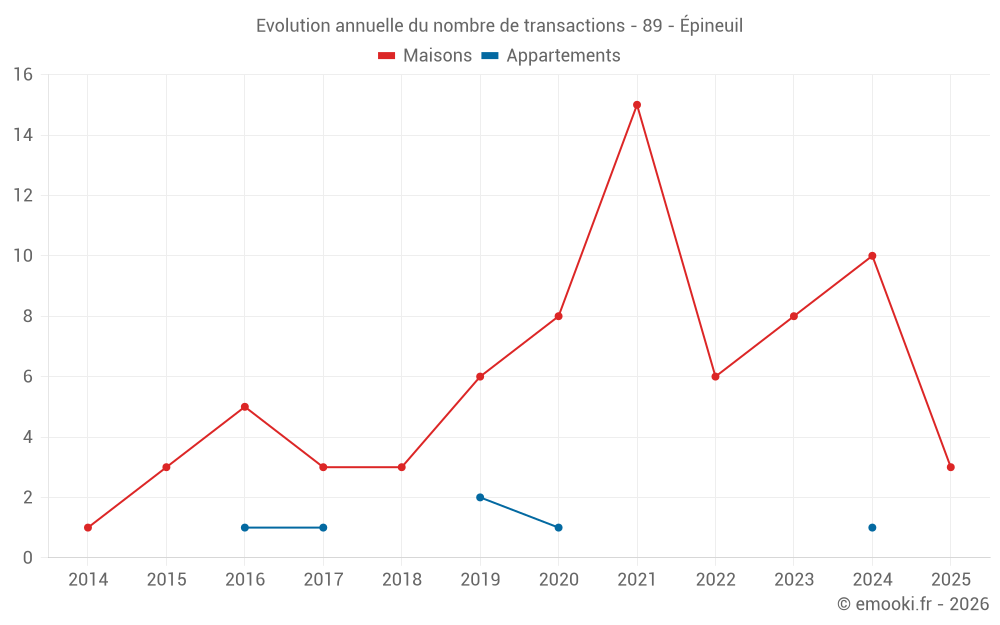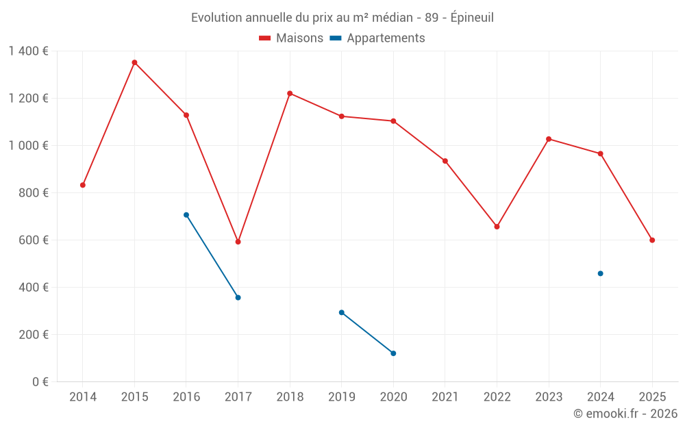 Le prix médian sur les 17 transactions de maisons des 24 derniers mois dans la commune d'Épineuil était de 1 000 € par mètre carré pour une valeur foncière médiane de 85 000 €. Sur cette période 60% des transactions se sont situées entre 601 et 1 406 € par mètre carré (du 2ème au 8ème déciles).