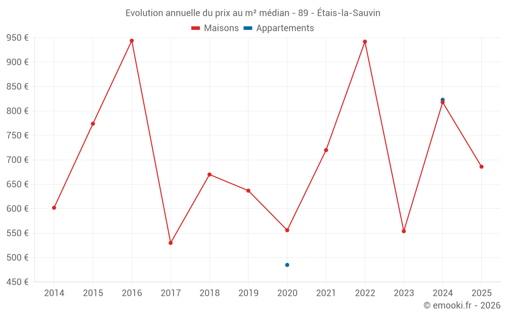 Le prix médian sur les 22 transactions de maisons des 24 derniers mois dans la commune d'Étais-la-Sauvin était de 786 € par mètre carré pour une valeur foncière médiane de 62 000 €. Sur cette période 60% des transactions se sont situées entre 398 et 1 195 € par mètre carré (du 2ème au 8ème déciles).