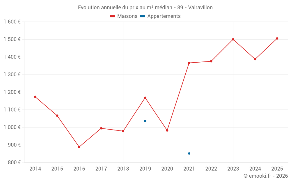 Le prix médian sur les 32 transactions de maisons des 24 derniers mois dans la commune de Valravillon était de 1 403 € par mètre carré pour une valeur foncière médiane de 153 000 €. Sur cette période 60% des transactions se sont situées entre 1 075 et 1 791 € par mètre carré (du 2ème au 8ème déciles).