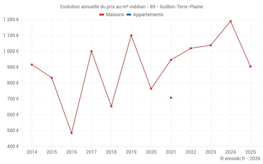 Le prix médian sur les 14 transactions de maisons des 24 derniers mois dans la commune de Guillon-Terre-Plaine était de 1 101 € par mètre carré pour une valeur foncière médiane de 104 000 €. Sur cette période 60% des transactions se sont situées entre 773 et 1 457 € par mètre carré (du 2ème au 8ème déciles).