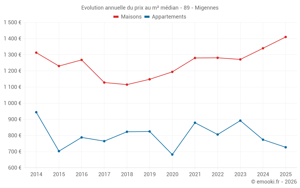 Le prix médian sur les 41 transactions de maisons des 12 derniers mois dans la commune de Migennes était de 1 410 € par mètre carré pour une valeur foncière médiane de 106 000 €. Sur cette période 60% des transactions se sont situées entre 1 182 et 1 758 € par mètre carré (du 2ème au 8ème déciles).