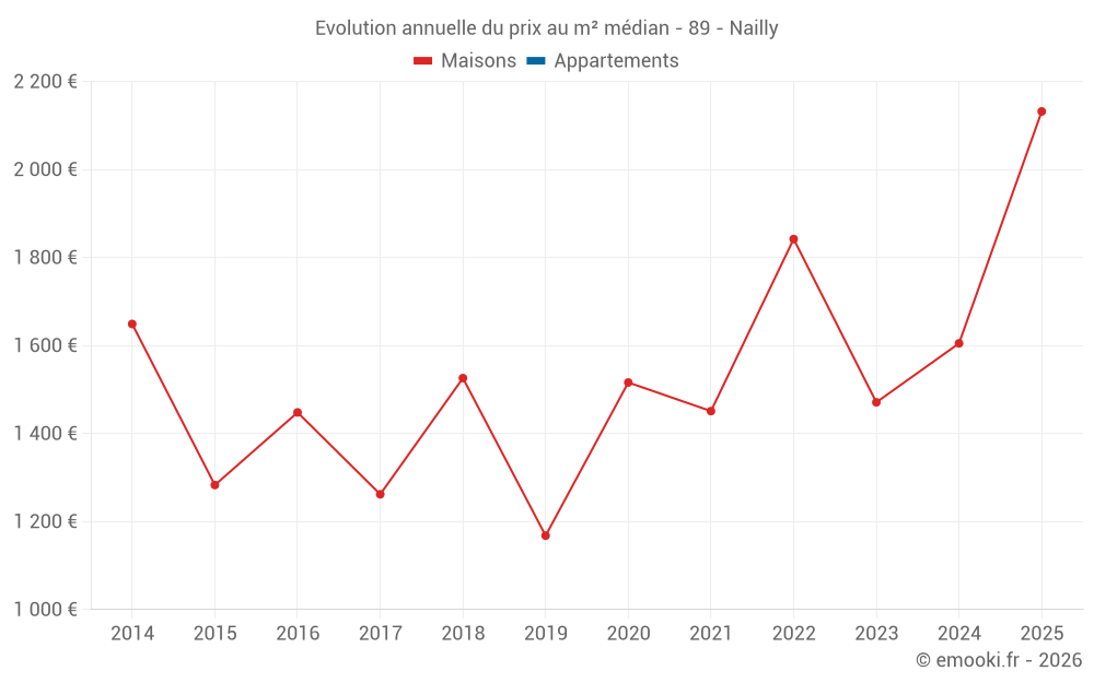 Le prix médian sur les 24 transactions de maisons des 24 derniers mois dans la commune de Nailly était de 1 642 € par mètre carré pour une valeur foncière médiane de 151 500 €. Sur cette période 60% des transactions se sont situées entre 1 146 et 2 080 € par mètre carré (du 2ème au 8ème déciles).