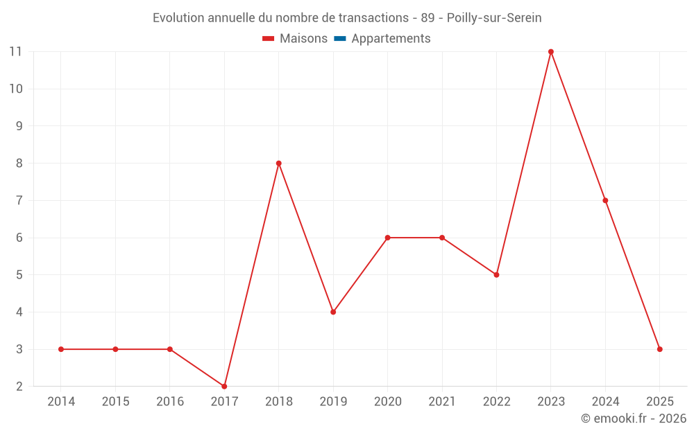 Le prix médian sur les 14 transactions de maisons des 24 derniers mois dans la commune de Poilly-sur-Serein était de 804 € par mètre carré pour une valeur foncière médiane de 42 500 €. Sur cette période 60% des transactions se sont situées entre 340 et 994 € par mètre carré (du 2ème au 8ème déciles).
