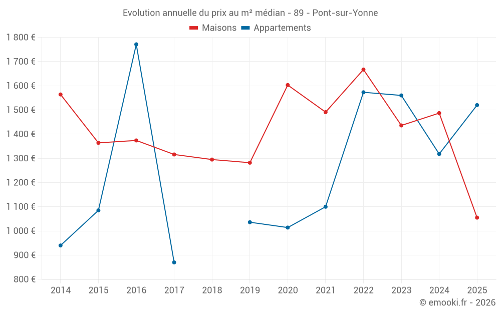 Le prix médian sur les 27 transactions de maisons des 12 derniers mois dans la commune de Pont-sur-Yonne était de 1 456 € par mètre carré pour une valeur foncière médiane de 113 000 €. Sur cette période 60% des transactions se sont situées entre 678 et 1 981 € par mètre carré (du 2ème au 8ème déciles).