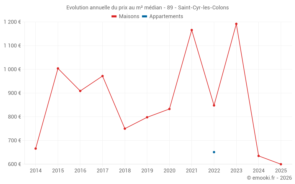 Le prix médian sur les 16 transactions de maisons des 24 derniers mois dans la commune de Saint-Cyr-les-Colons était de 650 € par mètre carré pour une valeur foncière médiane de 53 750 €. Sur cette période 60% des transactions se sont situées entre 371 et 1 304 € par mètre carré (du 2ème au 8ème déciles).
