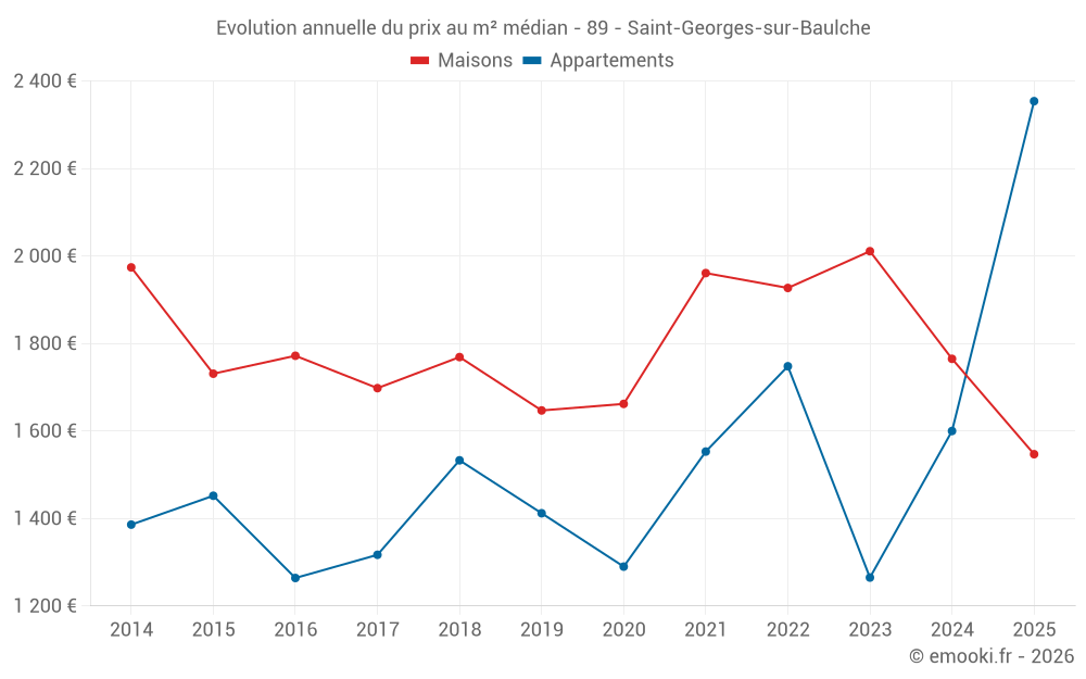 Le prix médian sur les 15 transactions d'appartements des 24 derniers mois dans la commune de Saint-Georges-sur-Baulche était de 1 768 € par mètre carré pour une valeur foncière médiane de 72 500 €. Sur cette période 60% des transactions se sont situées entre 1 157 et 2 321 € par mètre carré (du 2ème au 8ème déciles).