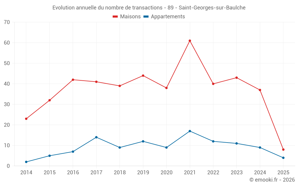 Le prix médian sur les 34 transactions de maisons des 12 derniers mois dans la commune de Saint-Georges-sur-Baulche était de 1 740 € par mètre carré pour une valeur foncière médiane de 152 750 €. Sur cette période 60% des transactions se sont situées entre 1 353 et 2 022 € par mètre carré (du 2ème au 8ème déciles).