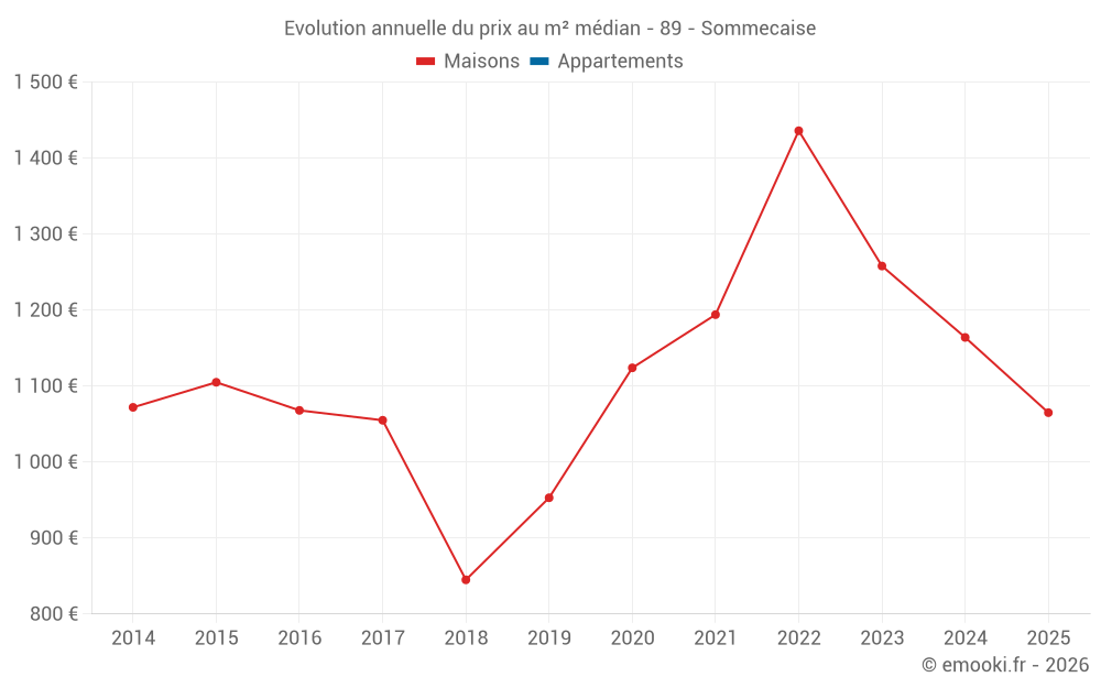 Le prix médian sur les 19 transactions de maisons des 24 derniers mois dans la commune de Sommecaise était de 1 164 € par mètre carré pour une valeur foncière médiane de 110 000 €. Sur cette période 60% des transactions se sont situées entre 945 et 1 616 € par mètre carré (du 2ème au 8ème déciles).