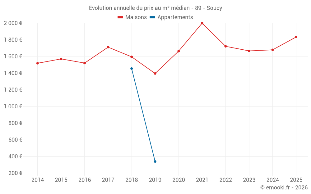 Le prix médian sur les 19 transactions de maisons des 12 derniers mois dans la commune de Soucy était de 1 844 € par mètre carré pour une valeur foncière médiane de 155 000 €. Sur cette période 60% des transactions se sont situées entre 1 461 et 2 327 € par mètre carré (du 2ème au 8ème déciles).