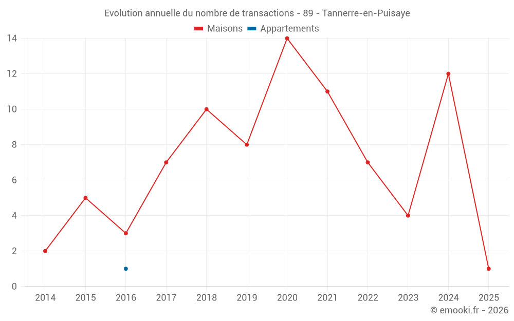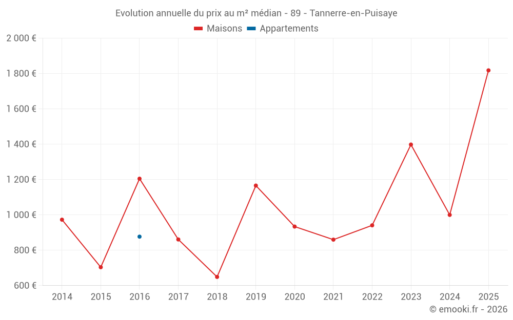Le prix médian sur les 15 transactions de maisons des 24 derniers mois dans la commune de Tannerre-en-Puisaye était de 1 033 € par mètre carré pour une valeur foncière médiane de 95 000 €. Sur cette période 60% des transactions se sont situées entre 741 et 1 804 € par mètre carré (du 2ème au 8ème déciles).