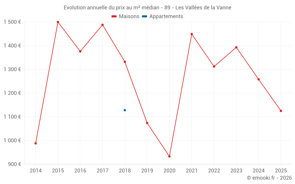 Le prix médian sur les 15 transactions de maisons des 24 derniers mois dans la commune des Vallées de la Vanne était de 1 296 € par mètre carré pour une valeur foncière médiane de 125 000 €. Sur cette période 60% des transactions se sont situées entre 862 et 1 557 € par mètre carré (du 2ème au 8ème déciles).