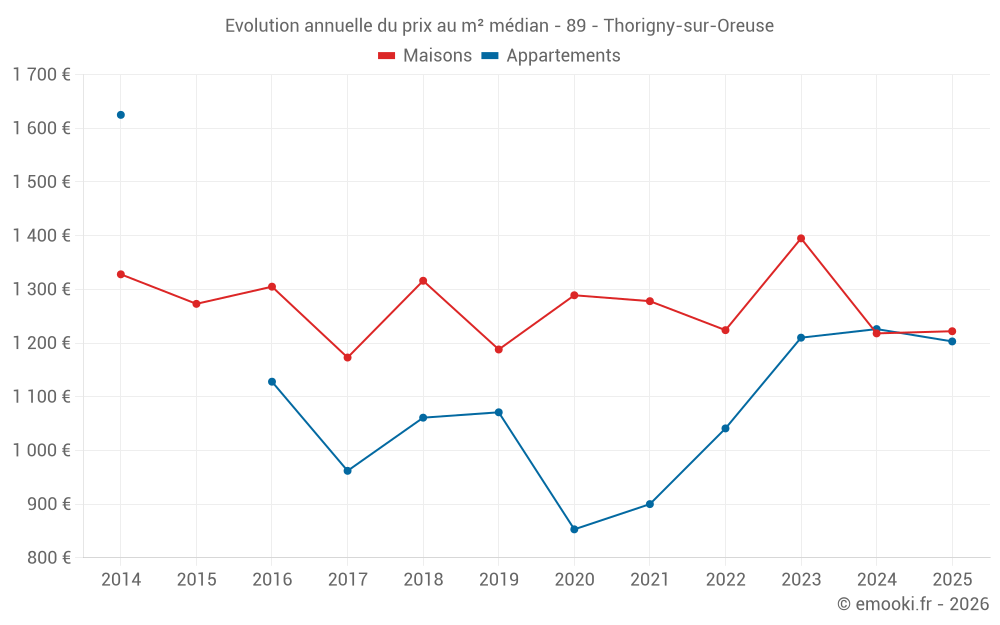 Le prix médian sur les 26 transactions de maisons des 12 derniers mois dans la commune de Thorigny-sur-Oreuse était de 1 217 € par mètre carré pour une valeur foncière médiane de 97 500 €. Sur cette période 60% des transactions se sont situées entre 889 et 1 418 € par mètre carré (du 2ème au 8ème déciles).