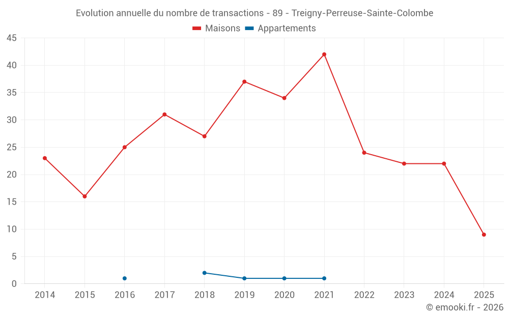 Le prix médian sur les 22 transactions de maisons des 12 derniers mois dans la commune de Treigny-Perreuse-Sainte-Colombe était de 757 € par mètre carré pour une valeur foncière médiane de 50 950 €. Sur cette période 60% des transactions se sont situées entre 361 et 1 310 € par mètre carré (du 2ème au 8ème déciles).