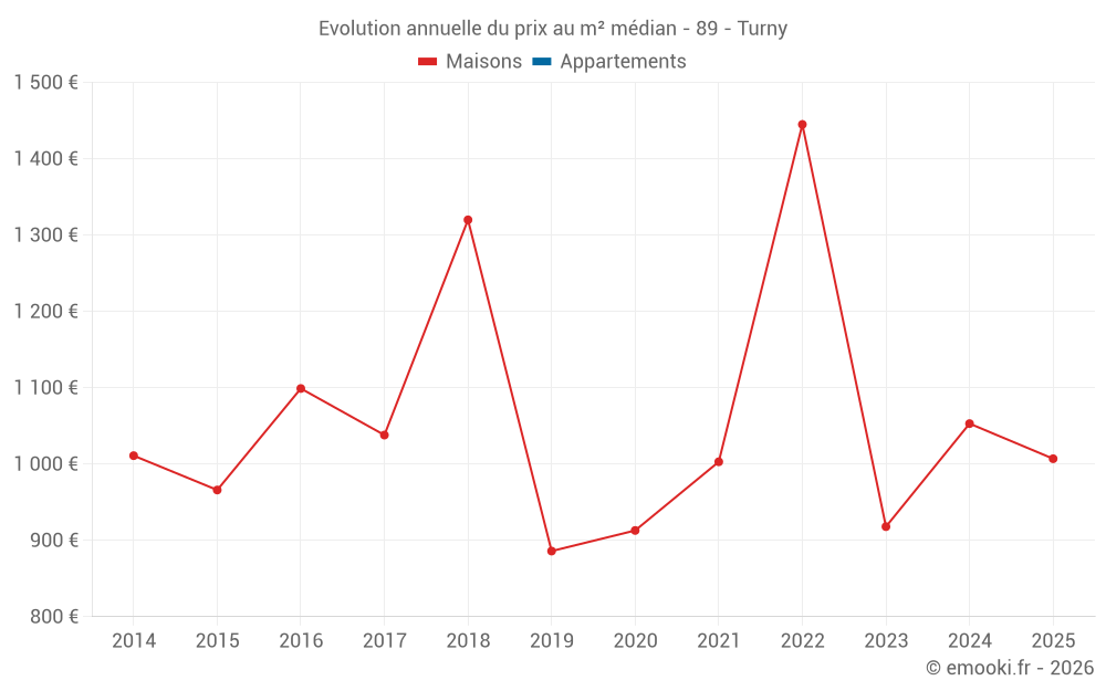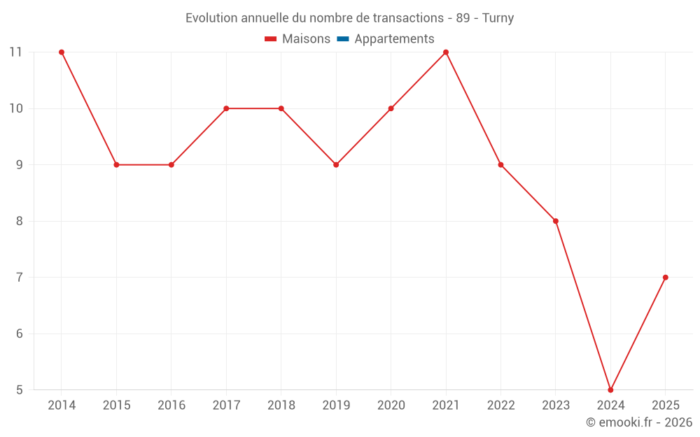 Le prix médian sur les 16 transactions de maisons des 24 derniers mois dans la commune de Turny était de 916 € par mètre carré pour une valeur foncière médiane de 87 500 €. Sur cette période 60% des transactions se sont situées entre 550 et 1 439 € par mètre carré (du 2ème au 8ème déciles).