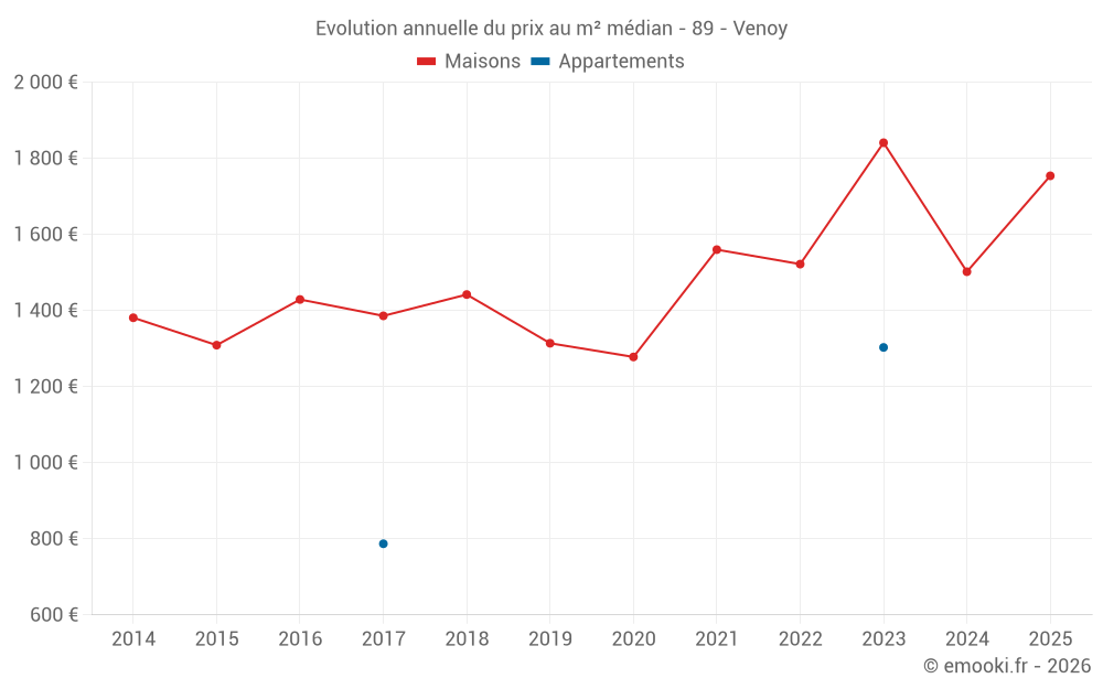 Le prix médian sur les 26 transactions de maisons des 24 derniers mois dans la commune de Venoy était de 1 706 € par mètre carré pour une valeur foncière médiane de 166 955 €. Sur cette période 60% des transactions se sont situées entre 1 333 et 2 260 € par mètre carré (du 2ème au 8ème déciles).