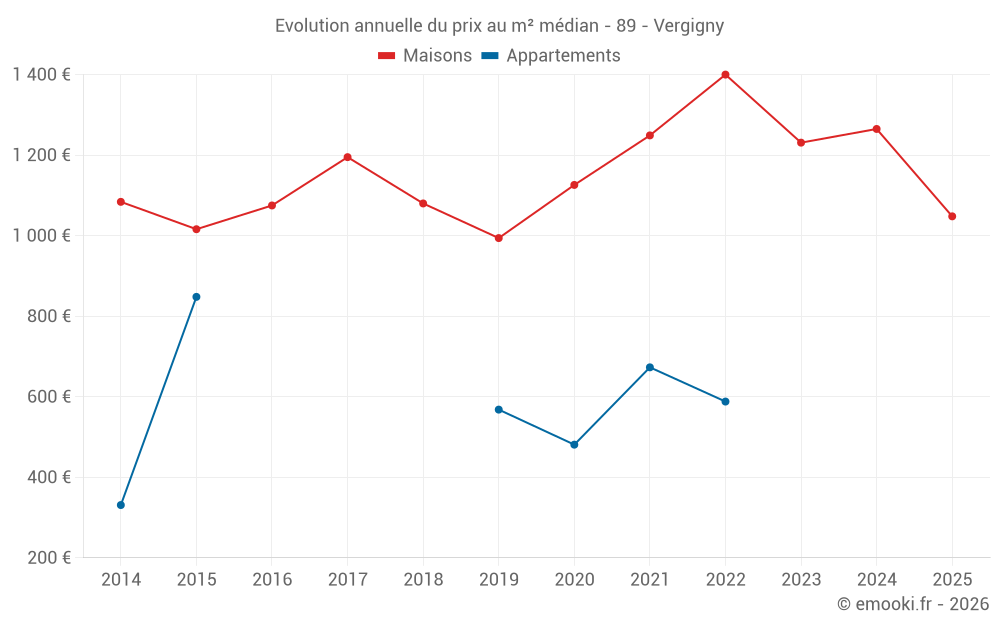 Le prix médian sur les 18 transactions de maisons des 24 derniers mois dans la commune de Vergigny était de 1 420 € par mètre carré pour une valeur foncière médiane de 120 000 €. Sur cette période 60% des transactions se sont situées entre 775 et 1 666 € par mètre carré (du 2ème au 8ème déciles).