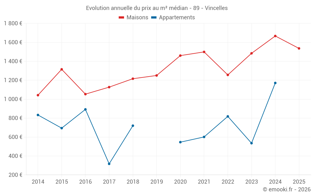 Le prix médian sur les 21 transactions de maisons des 24 derniers mois dans la commune de Vincelles était de 1 579 € par mètre carré pour une valeur foncière médiane de 120 000 €. Sur cette période 60% des transactions se sont situées entre 953 et 1 765 € par mètre carré (du 2ème au 8ème déciles).