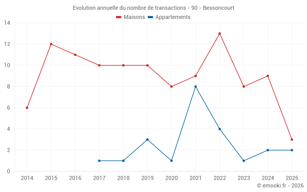 Le prix médian sur les 20 transactions de maisons des 24 derniers mois dans la commune de Bessoncourt était de 1 867 € par mètre carré pour une valeur foncière médiane de 239 150 €. Sur cette période 60% des transactions se sont situées entre 1 129 et 2 403 € par mètre carré (du 2ème au 8ème déciles).