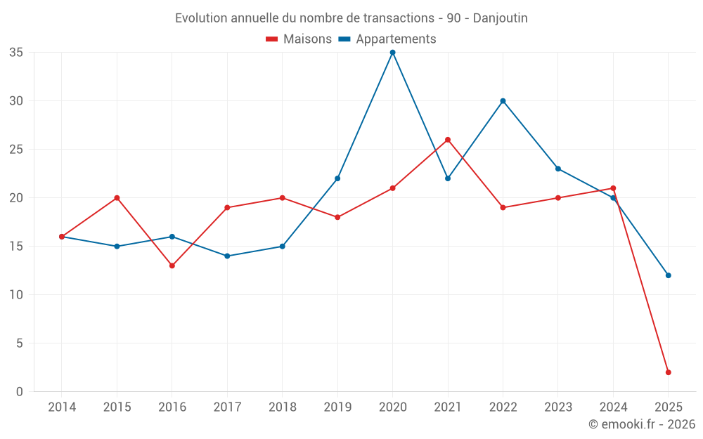 Le prix médian sur les 16 transactions de maisons des 12 derniers mois dans la commune de Danjoutin était de 1 701 € par mètre carré pour une valeur foncière médiane de 193 750 €. Sur cette période 60% des transactions se sont situées entre 1 100 et 2 267 € par mètre carré (du 2ème au 8ème déciles).