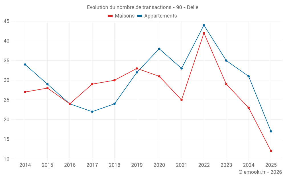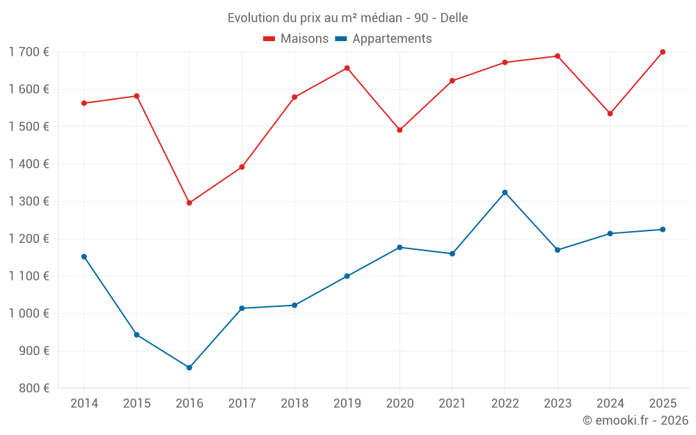 Le prix médian sur les 28 transactions de maisons des 12 derniers mois dans la commune de Delle était de 1 574 € par mètre carré pour une valeur foncière médiane de 173 000 €. Sur cette période 60% des transactions se sont situées entre 1 234 et 2 210 € par mètre carré (du 2ème au 8ème déciles).