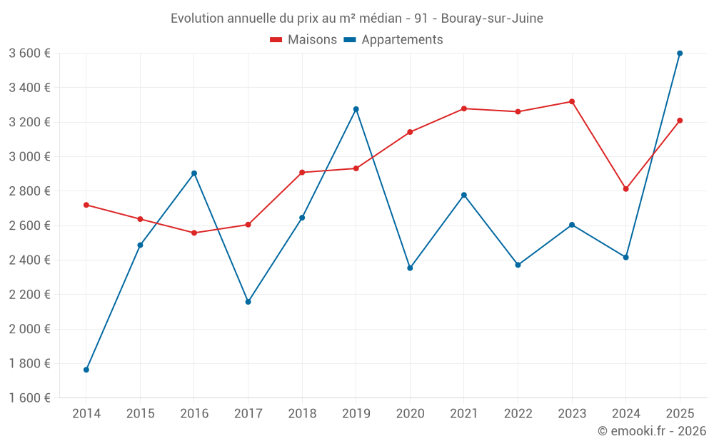 Le prix médian sur les 19 transactions de maisons des 12 derniers mois dans la commune de Bouray-sur-Juine était de 2 975 € par mètre carré pour une valeur foncière médiane de 305 000 €. Sur cette période 60% des transactions se sont situées entre 2 420 et 3 937 € par mètre carré (du 2ème au 8ème déciles).