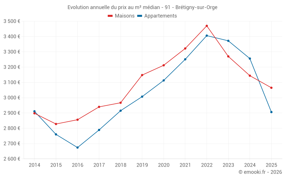 Le prix médian sur les 31 transactions de maisons des 6 derniers mois dans la commune de Brétigny-sur-Orge était de 3 065 € par mètre carré pour une valeur foncière médiane de 260 000 €. Sur cette période 60% des transactions se sont situées entre 2 468 et 3 815 € par mètre carré (du 2ème au 8ème déciles).
